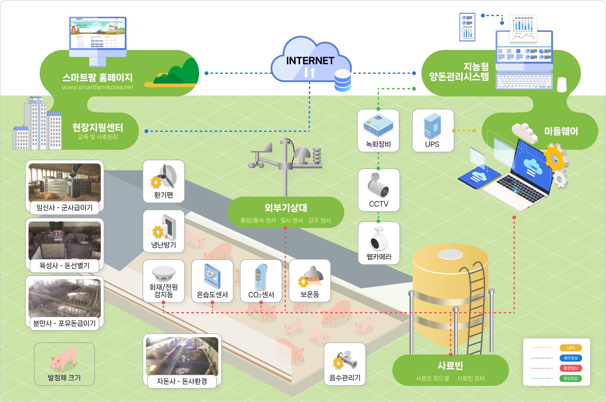 | 돈사 환경 관리 | 내부환경관리장비 | 온도, 습도, co2, 조도, 암모니아, 이산화탄소, 누전(정전)감지 등 |